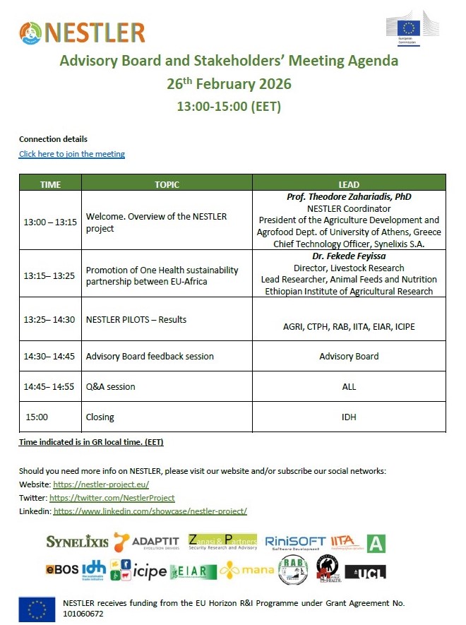 The 2nd Advisory Board and 3rd Stakeholders Group Meeting of NESTLER was held online on the 26th of February 2026. It was attended by external advisory board members and the consortium partners. The advisory board consists of four external experts, namely Prof. C. Egesi, Prof. D. Ladakis, Dr. E. Baafi and Mr. D. Skias.